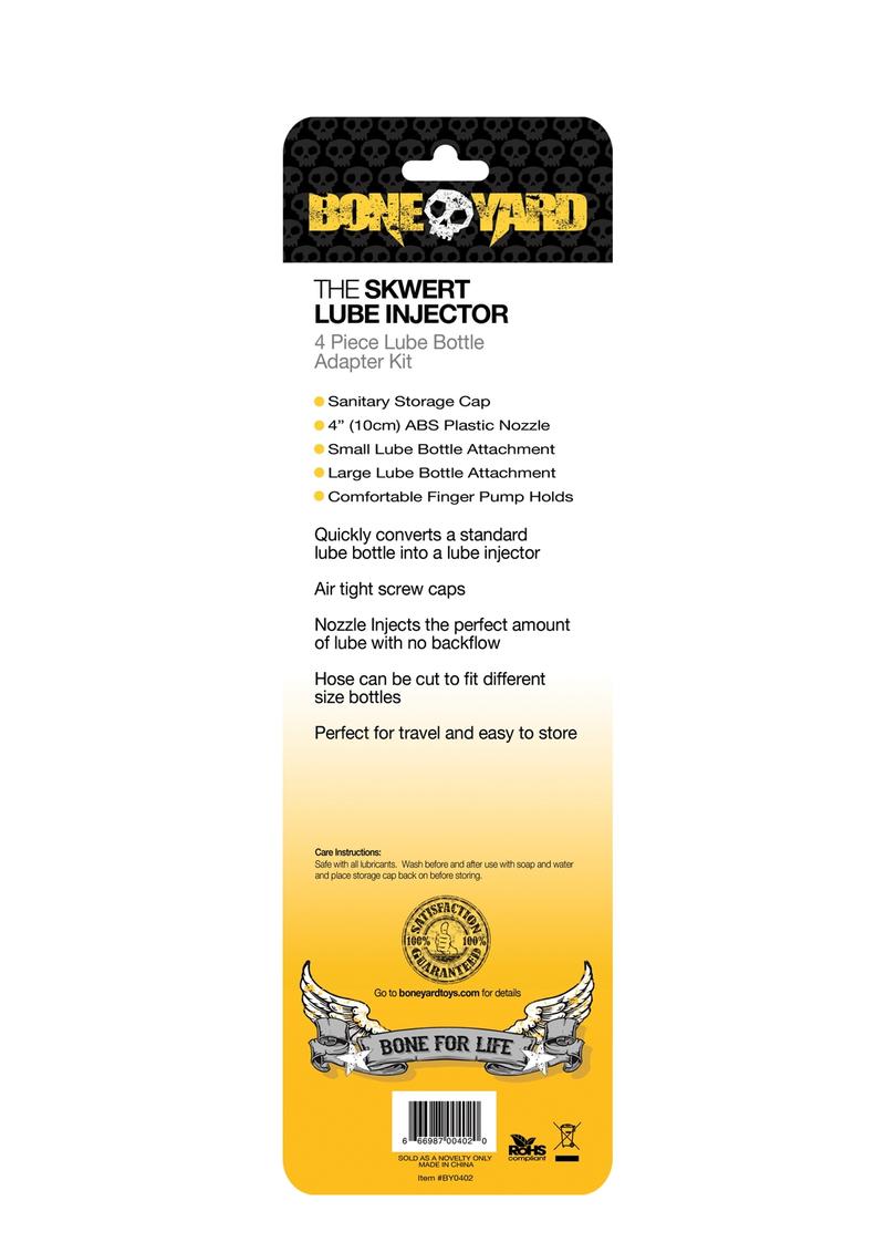 4andrdquo; (10cm) ABS Plastic Nozzle Small Lube Bottle Attachment Large Lube Bottle Attachment Comfortable Finger Pump Holds Sanitary ABS Storage Cap The Skwert Lube Injector quickly converts most lube bottles into a lube or. Forget those messy syringes, the Lube Injector makes deep lubrication easy. The 4andrdquo; (10cm) interchangeable plastic or comes with a small and large lube bottle cap. The or has comfortable finger pump holds, that lets you the perfect amount of lubricant with no backflow. The or also comes with a sanitary storage/travel cap. The stem attachment can be cut to fit multiple size bottles.This product is safe with all lubricants, completely hypoallergenic, non-irritating and compatible with sensitive skin. Care Instructions:Wash thoroughly with mild soap and warm water or toy cleaner. Pat dry and allow product to completely air dry. Store separately.