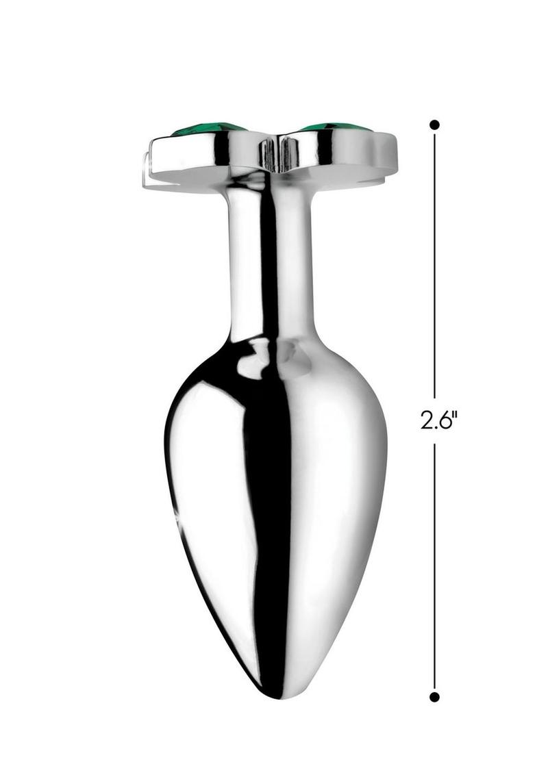 Make that booty get lucky with this hefty metal anal plug with a clover jewel design at the base! Pop this lucky charm in your pot-o-gold to appreciate the comfortable weight inside your body, thanks to the nickel-free aluminum alloy material. Great for temperature play, you can warm it or cool it in water before ion. The attractive shape of the base will surprise your partner when you bend over. Shake that shamrock! Use with any lubricant of your choosing and clean after use with mild soap or toy cleaner.Measurements: 2.6 inches in total length, 2.4 inches able length, 1 inch at widest diameter, .4 inches in diameter at stem (Circumference 3.141) Material: Aluminum Alloy, ABS PlasticColor: Green