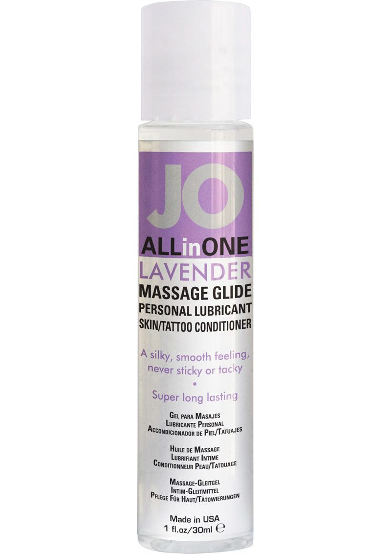 JO Massage Glide Lavender is designed to let you relax and allows you to safely experience sensual massage and sexual intimacy in one pleasurable session. JO Massage Glide is silicone based and its unique formula provides a silky smooth massage, and never leaves your skin feeling greasy, oily or tacky. – Long Lasting- 1 Drop of JO Glide equals 10-15 Drops of other Massage Oils- No Perfumes and Formulated with the Highest Grade Essential Oils.- Aroma Therapeutic- Can be Used as a Personal Lubricant- Terrific tattoo and Skin Conditioner- 100% latex safe