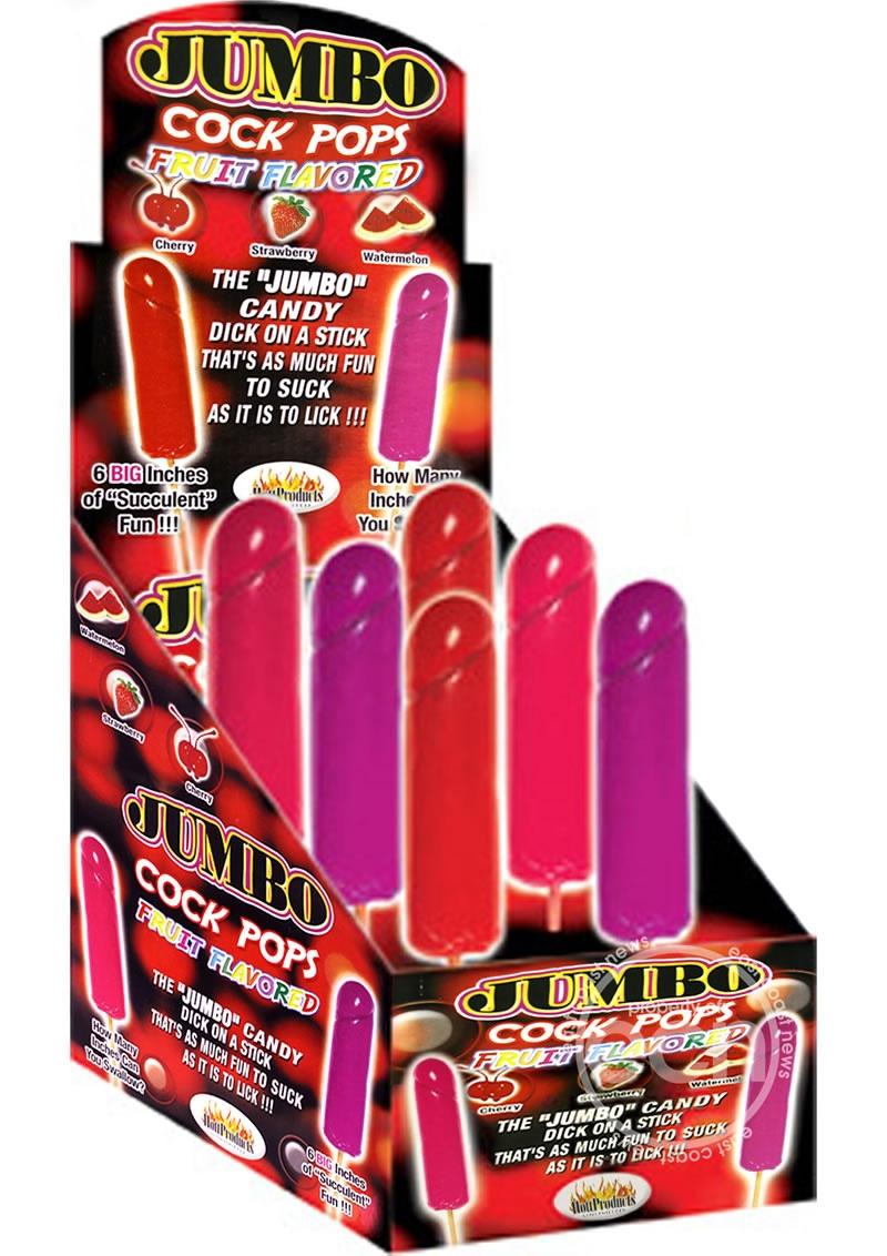 The Jumbo candy dick on a stick that`s as much fun to suck as it is to lick!!! 6 BIG Inches of Succulent Fun!!! Flavors include: Cherry, strawberry, and watermelon.