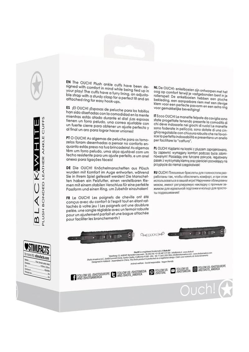 The OUCH! Plush ankle cuffs have been designed with comfort in mind while being tied up in your play! The cuffs have a furry lining, an adjustable strap with a sturdy clasp for a perfect fit and an attached ring for easy hook-ups