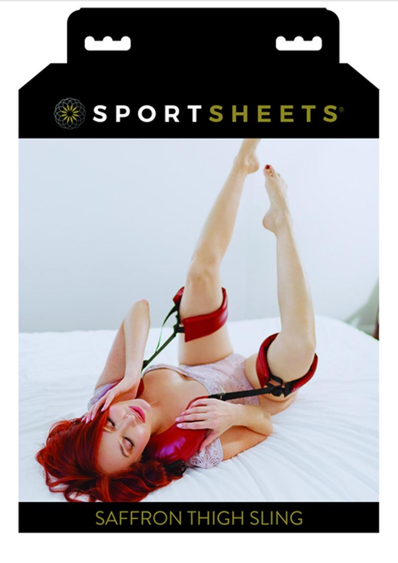 This easy-to-use sling allows you to stay in those perfect positions for the best angles of penetration! The soft neck and leg rests provide comfortable cushions as you recline, while the tethers use your own body weight to keep those thighs high and mighty. Neither you, nor you partner will have to hold those legs up with your hands anymore, leaving them free to roam to other body parts. Wrap the comfortable leg rests around your thighs, or put your feet in them like stirrups. WIth you legs pulled back, your partner will be able to reach greater depth and always hit the right spot, resulting in a more satisfying experience for both of you! The neck rest ensures that you have a better view than ever before.The Saffron Thigh Sling holds legs up effortlessly leaving hands free. Slide the padded straps around feet or thighs. Quickly adjust legs up and down by pulling and releasing the straps connected to the neck pillow. Comfort and support means deeper and more effective penetration even for those with strength or mobility limitations. Fits up to 32 inch thighs Soft neck and leg rests Allows for the best angles of penetration
