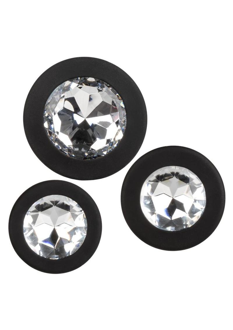 Pure silicone anal training kit with Satin Finish Designed for comfort and extended wear 3 graduated sizes tapered for a perfect fit Flanged base with gem inlay Smooth and seamless Hygienically superior and body safe Dimensions: Small Probe: 2.5 x 1 in. Medium Probe: 3 x 1.25 in. Large Probe: 3.5 x 1.75 in.