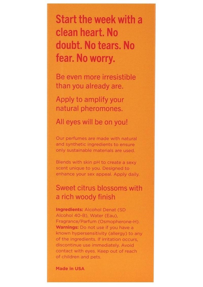 Sweet citrus blossoms with a rich woody finish. Top Notes: Citrus accord, orange blossom, luscious william pear. Mid Notes: Pearl tuberose accord, white gardenia, sambac jasmine. Bottom Notes: Crystal amber, blonde cedarwood, warmed benzoin. Start the week with a clean heart. No doubt. No tears. No fear. No worry. Be even more irresistible than you already are. Apply to amplify your natural pheromones. All eyes will be in you! Hold fragrance 5-7 inches away from skin and apply to pulse points. Blends with skin pH to create a sexy scent unique to you. Designed to enhance your sex appeal.